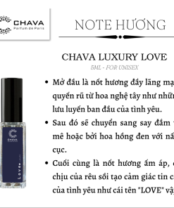 - Chava Luxury Love mang đến mùi hương quyến rũ và lôi cuốn với những nốt hương đầy mê hoặc. Bắt đầu bằng hương thơm lãng mạn quý phái từ hoa nghệ tây như những lưu luyến ban đầu của tình yêu. Sau đó mùi hương dần chuyển sang say đắm và mê hoặc của hoa hồng đen kết hợp với nấm cục và hương hoa. Cuối cùng nốt hương ấm áp dễ chịu tạo cảm giác tin cậy của rêu sồi hướng đến một tình yêu dài lâu vô điều kiện.