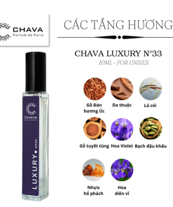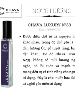 - Chava Luxury N033 chính là một bản tuyên ngôn cho sự sáng tạo về mùi hương bởi những nét chấm phá riêng biệt qua mùi ám khói, đặc biệt chai nước hoa đẳng cấp này còn khơi dậy sự sống mãnh liệt của rừng già bạc ngàn với hàng niên kỷ.