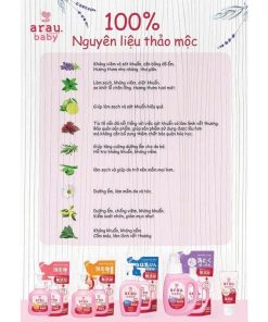 – Nước vệ sinh bình sữa Arau Baby không chứa chất tạo mùi tổng hợp. Thành phần gồm các chiết xuất thảo mộc với hương thơm tự nhiên của cây cỏ vừa làm mất mùi các vết bẩn được rửa, vừa làm át mùi của chất béo tự nhiên thường có trong thành phần của xà phòng, an toàn tuyệt đối khi sử dụng các dụng cụ đã được làm sạch từ nước rửa bình Arau Baby.