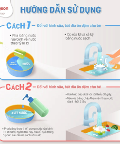 – Cách 2: Cho đồ cần rửa vào một bát nước lớn hoặc chậu rửa, cho một lượng nhỏ (~ 2ml) cho mỗi 1 lít nước. Chà bình thường và sau đó rửa sạch bằng nước