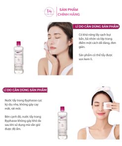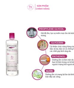 Nước tẩy trang Byphasse giúp tẩy sạch hiệu quả các chất bẩn và bã nhờn sâu trong lỗ chân lông cùng với lớp trang điểm trên da, công nghệ tiên tiến Micellar với các hạt dầu cực nhỏ giúp tẩy trang sạch không gây bết dính sau khi sử dụng. Có chứa nước khoáng giúp rửa sạch các chất bẩn còn sót lại trước khi làm sạch với nước.