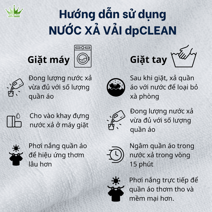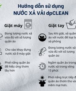 ✔ Giặt máy: hòa tan 1 nắp nước xả vải đậm đặc dpCLEAN vào nước xả cuối cùng, hoặc đổ trực tiếp vào hộc chứa nước xả vải của máy.