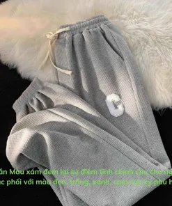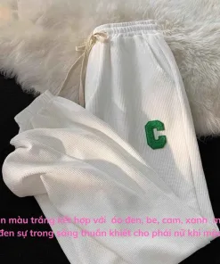 - Cạp quần co dãn có dây buộc. có dập chữ C một bên ống quần.