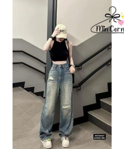 Tên sản phẩm: Quần Jean Nữ Ống Rộng Wash Bụi Rách Phối Màu Đai Kiểu Phía Trước MQ180 – MIN CORNER