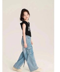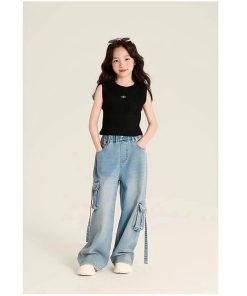 Quần Jean Ống Suông Túi Hộp Dây Bé Gái Phong Cách Hàn, Jean Cotton Mềm Nhẹ – 2 Màu Cá Tính Từ 18-50kg Dành Cho Bé Gái