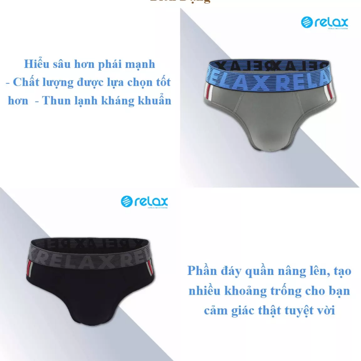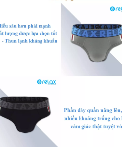 - Quần lót nam Relax Underwear – Brief với form ôm gọn phần mông và phần trước, đường cắt từ bẹn lên hai bên hông có độ nghiêng. Chúng sẽ tạo ra cảm giác hỗ trợ và nâng đỡ cần thiết cho phần dưới của các chàng trai, trong khi phần chân vẫn được tự do.
