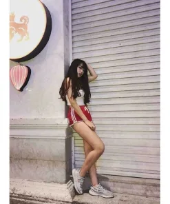 Dáng: quần short trên đầu gối, có sọc trắng cạnh sườn