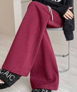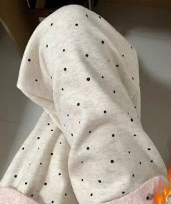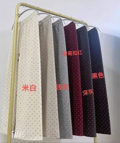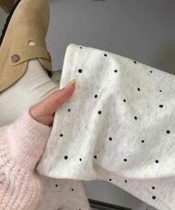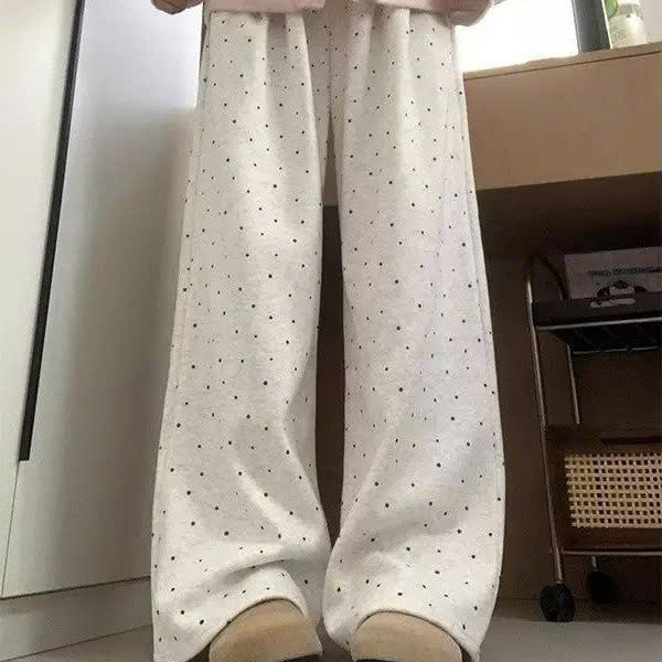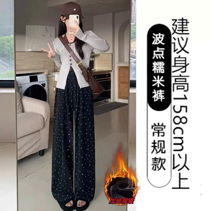 2. Chất liệu: Vải thun cotton , lót lông cừu. Thiết kế quần suông ống rộng ống đứng , hoạ tiết chấm bi có lót lông cừu, dày dặn, lưng cao, phong cách Hàn Quốc