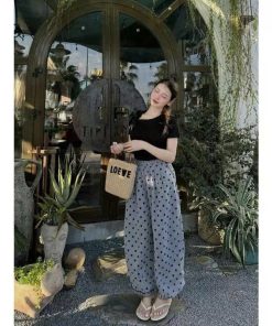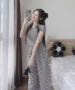 [ Rẻ Vô địch ] Set Bộ áo Phông Croptop Cài Nơ Vai + Mix Quần Dài ống Xuông Chấm Bi Xám