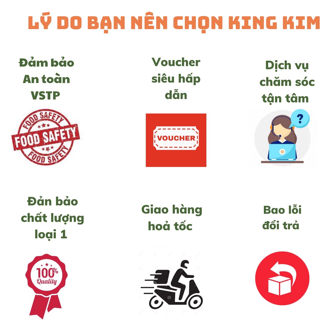 - An toàn, đảm bảo: Đồ ăn ở King Kim đều có giấy chứng nhận An toàn vệ sinh thực phẩm, Bao bì đóng hộp chắc chắn, đầy đủ ngày sản xuất và hạn sử dụng. nên bạn yên tâm đồ ăn chắc chắn sẽ luôn còn mới và ngon lành cho đến khi bạn nhận được.