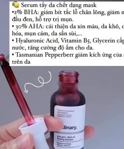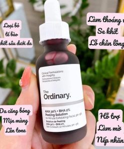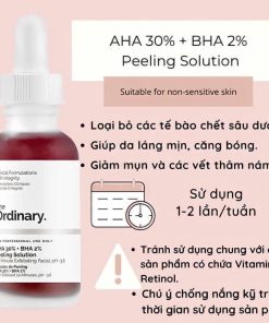 The Ordinary AHA 30% + BHA 2% Peeling Solution là 1 dạng của tẩy tế bào chết nhưng chuyên sâu hơn những loại tẩy tế bào chết hóa học với nồng độ thấp, chứa chiết xuất thảo dược từ cây đàn Tasmania kết hợp với 2% BHA, 30% AHA (Glycolic, Lactic, Citrid, Tartaric acid), Hyaluronic acid, Vitamin B5, Glycerin, Black Carrot,… giúp kích thích thông thoáng và giảm tình trạng tắt nghẽn lỗ chân lông, hỗ trợ trị mụn và thâm mụn, loại bỏ lớp sừng già cỗi, cải thiện bề mặt da, tăng cường độ ẩm, chống oxy hóa, giảm kích ứng, tái tạo tế bào da mới, dưỡng da căng mịn và đều màu,…