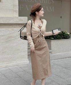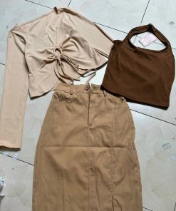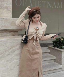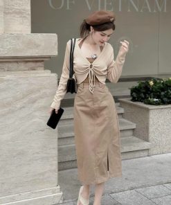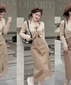 SET 3 MÓN CHÂN VÁY KAKI XẺ TÀ TRONG MIX ÁO KHOÁC THUN GÂN ST1107- SAM FREESIZE < 53KG