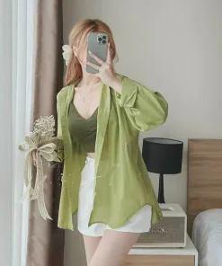 Tên sản phẩm: SET 3 MÓN ĐI BIỂN ÁO SƠ MI TAY DÀI KÈM ÁO CROPTOP & QUẦN SHORT T973