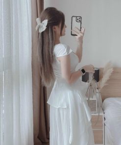 Tên sản phẩm: Set áo bèo vải lụa Nhung màu trắng kèm chân váy voan V27 – HAKA MÂY