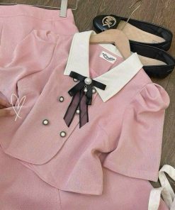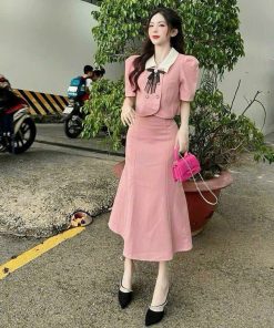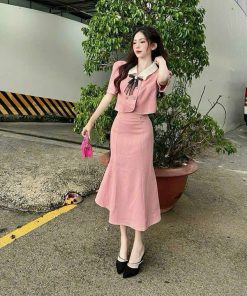 SET ÁO CÀI NÚT KÈM NƠ PHỐI CHÂN VÁY ĐUÔI CÁ BH100Y- NANA FREESIZE < 53KG