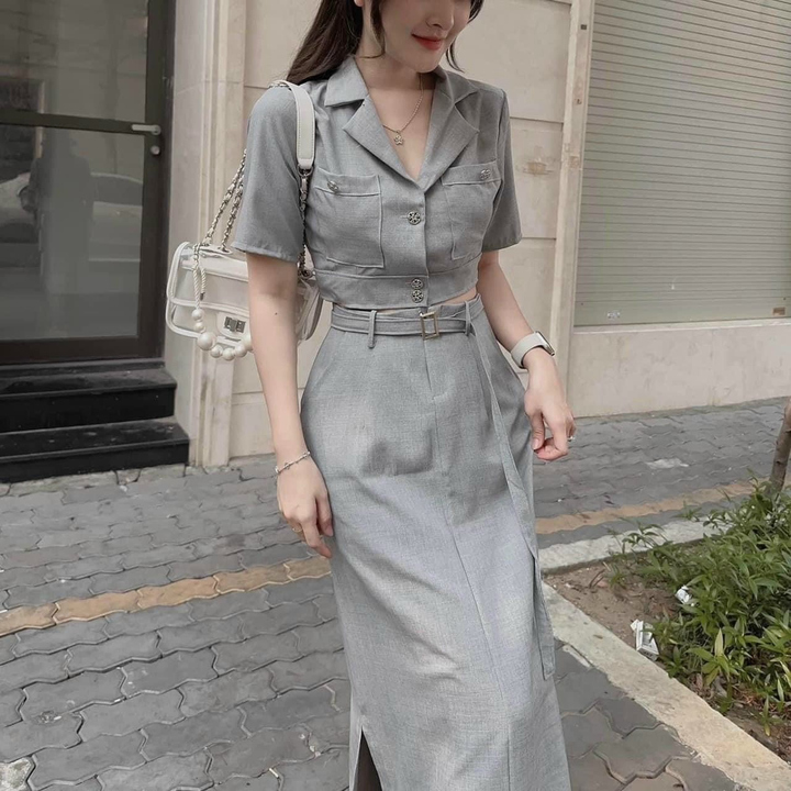 Tên sản phẩm: SET ÁO CỔ VEST KÈM CHÂN VÁY (CÓ ĐAI CÀI NÚT) V941H – AINE