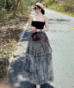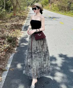 SET ÁO CÚP NGỰC BOZIP PHỐI CHÂN VÁY XÒE VẢI VOAN DÀI CÓ LÓT SH105V- SAM FREESIZE < 55KG