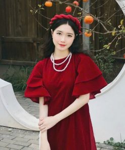 SET ÁO DÀI NHUNG TAY BÈO 2 LỚP KÈM QUẦN TUYẾT NHUNG SH1255- SAM FREESIZE < 55KG