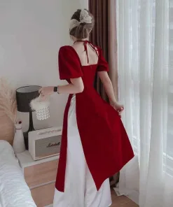 - Tên sản phẩm: Set Áo Dài Tết Cách Tân Yếm Nhung Đỏ Vn0122 – Vanass