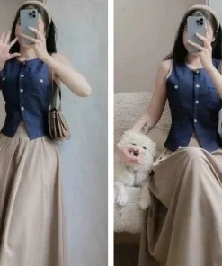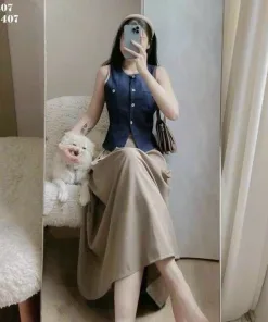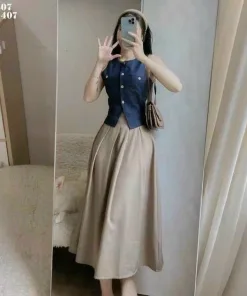 SET ÁO DENIM GILE CÀI NÚT PHỐI CHÂN VÁY COTTON LẠNH ST85K- SAM FREESIZE < 53KG