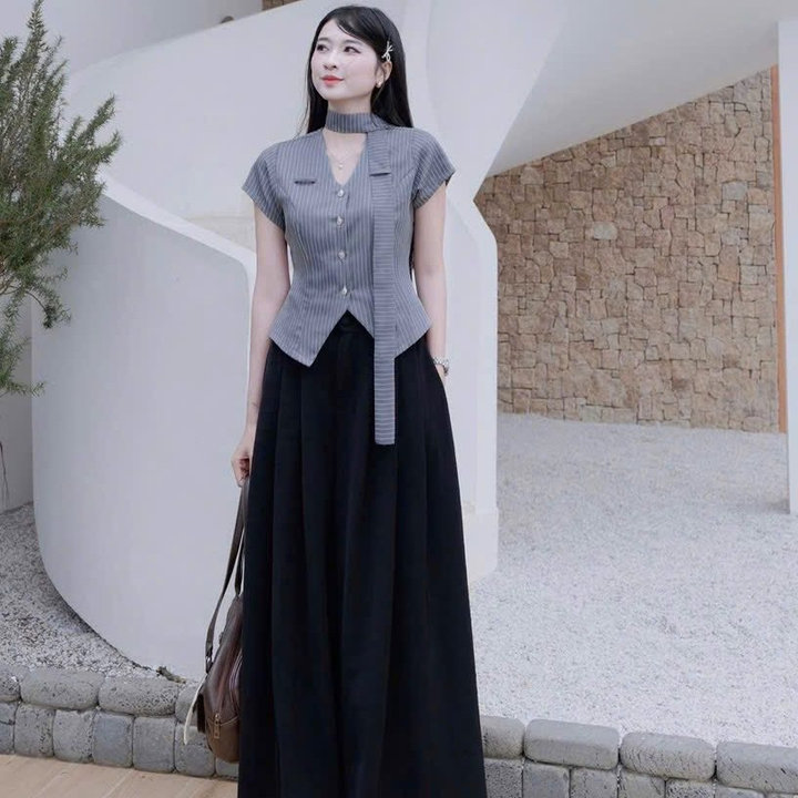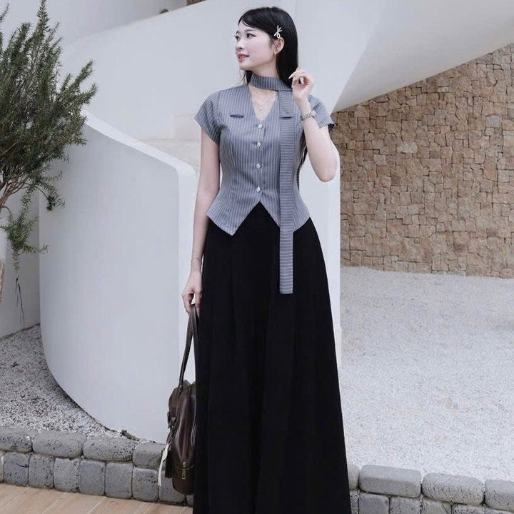 SET ÁO KATE SỌC QUẦN MANGO DÀI ỐNG RỘNG KÈM KHĂN TB120RS- FREESIZE < 53KG