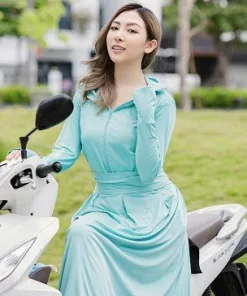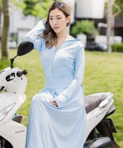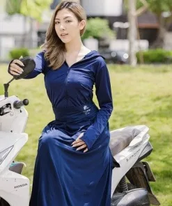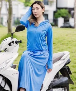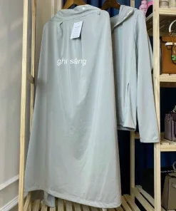 - Áo khoác chống nắng nữ có mũ trùm đầu, che mu bàn tay, trùm tay xỏ ngón. Áo khoác chống nắng toàn thân có khóa kéo cao lên tận mũ có thể làm khẩu trang chắn bụi, đường may cẩn thận.