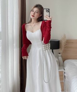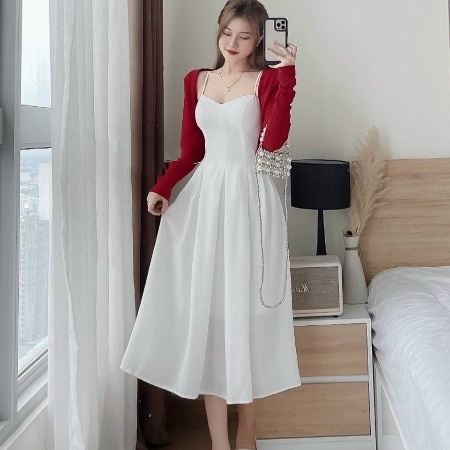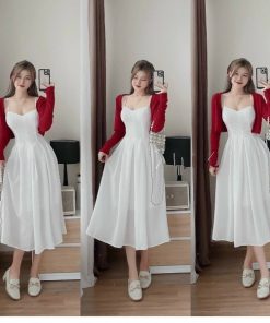 Tên sản phẩm: Set áo khoác tăm gân kèm đầm xếp ly lụa nhung ( có mút ) V36 – HAKA MÂY