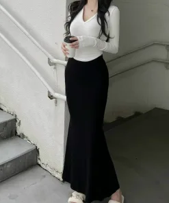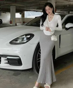 Set đồ bao gồm 1 chiếc áo ôm body form ngắn ôm sát cơ thể, kèm 1 chân váy đuôi cá dáng dài tôn lên vòng eo quyến rũ cực sang trọng.