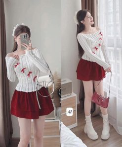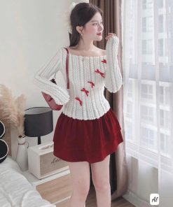 SET ÁO LEN REN ĐÍNH NƠ PHỐI CHÂN VÁY NHUNG CÓ LÓT BT115R- SAM FREESIZE < 53KG