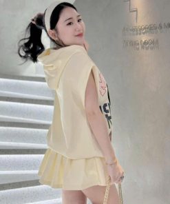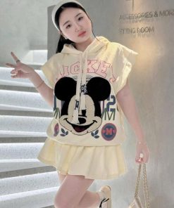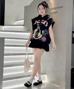 SET ÁO NỈ IN MICKEY CÓ NÓN PHỐI CHÂN VÁY NỈ XẾP LY MT100G- SAM FREESIZE< 53KG