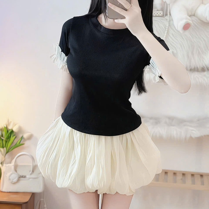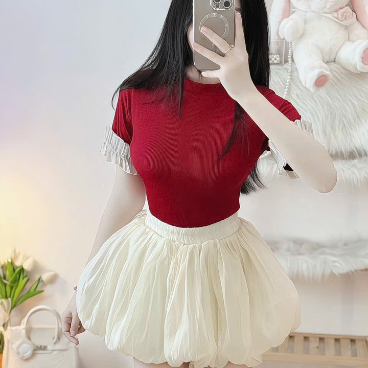 Chất liệu: áo tăm lạnh phối tơ + váy tơ lụa 2 lớp