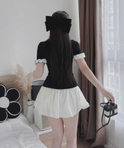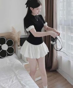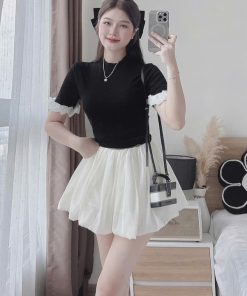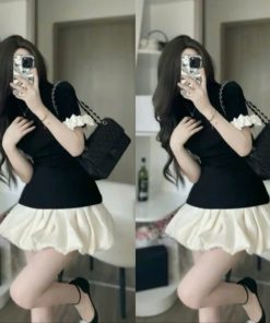 Chất liệu: áo thun gân tăm lạnh, chân váy vải tơ nến