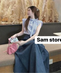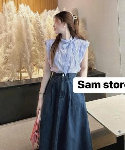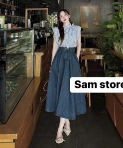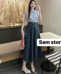 SET ÁO SƠ MI KATE CỔ CÁCH ĐIỆU PHỐI CHÂN VÁY DENIM KÈM NỊT BH110R-SAM FREESIZE < 53KG