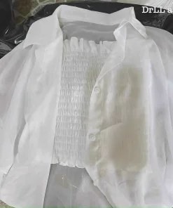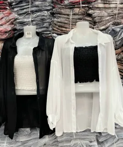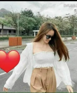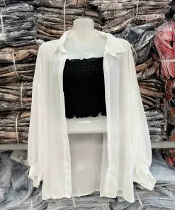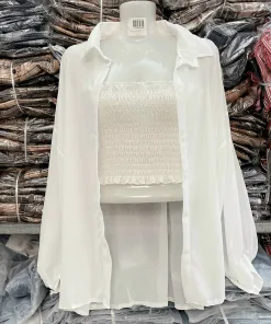 - Sản phẩm gồm áo sơmi voan tay dài (khoác ngoài) kèm áo ống nhún bên tròn dáng croptop.