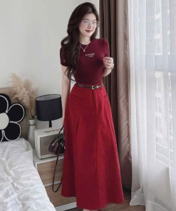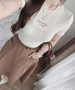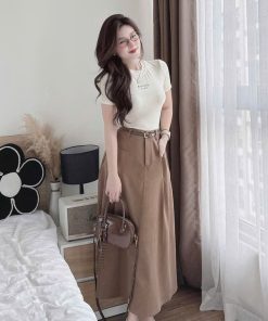 SET ÁO THUN THÊU CHỮ MIX CHÂN VÁY KAKI CÓ TÚI KÈM DÂY NỊT TB115LK-NANA FREESIZE < 53KG