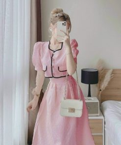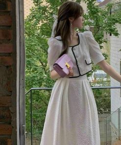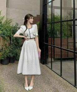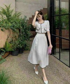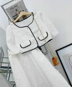 Tên sản phẩm: SET ÁO VIỀN NÉ CÀI NÚT THẬT KÈM CHÂN VÁY XÒE DÀI CÓ LÓT VẢI XỐP NHẬT T327
