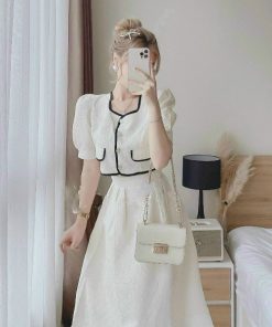 Tên sản phẩm: SET ÁO VIỀN NÉ CÀI NÚT THẬT KÈM CHÂN VÁY XÒE DÀI CÓ LÓT VẢI XỐP NHẬT T327
