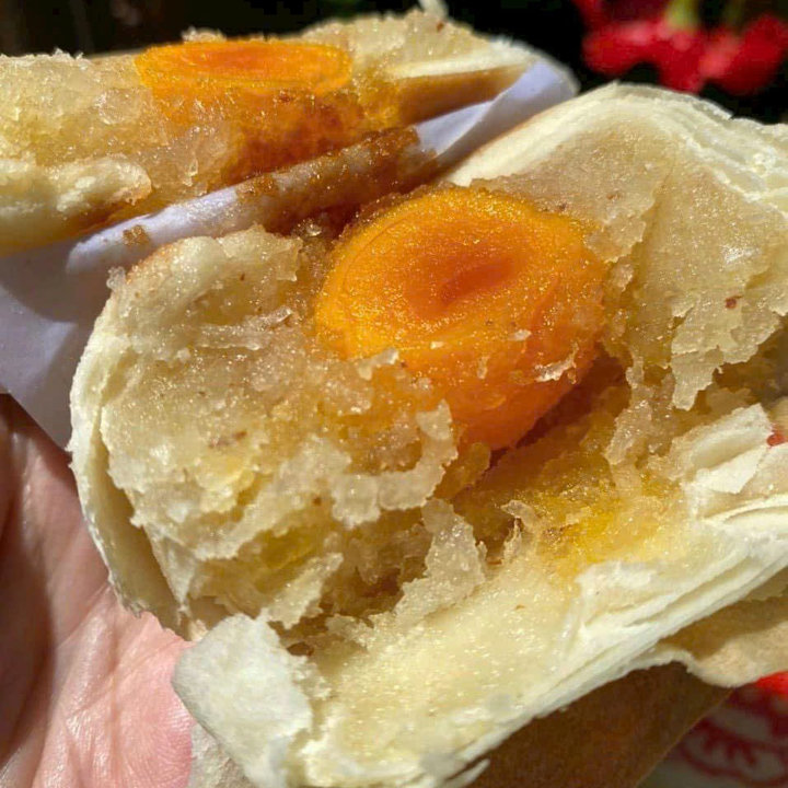 ✔️ Trứng muối béo bùi hòa quyện cùng mỡ đường dẻo mịn và mứt bí xào giòn ngọt.