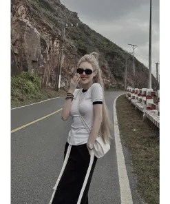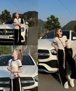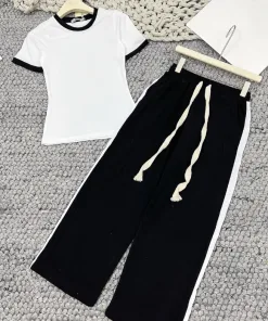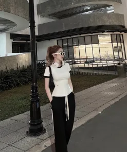 Set bộ bao gồm 1 áo trắng cổ tròn phối viền đen và 1 quần dài ống rộng dang suông phối kẻ trắng 2 bên ống quần