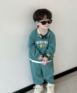 – Thiết kế set áo nỉ tay dài, quần dài bo ống phóng cách thể thao, hàn basic . Áo cổ tròn bo gân, form hơi rộng, tạo cảm giác thoải mái cho bé. Quần dài cạp chun mềm, ống bo gọn, có logo nhỏ đồng bộ với áo