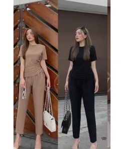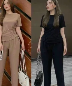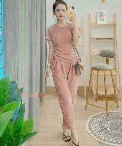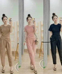 Tên sản phẩm: SET BỘ ĐỒ NỮ ÁO CỔ TRÒN TAY NGẮN FORM THỤNG RÚT DÂY KÈM QUẦN DÀI T944