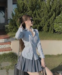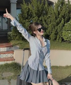 SET BỘ ĐỒ NỮ ÁO SƠ MI SỌC MIX CHÂN VÁY XẾP LY BH010 – SAM FREESIZE < 53KG