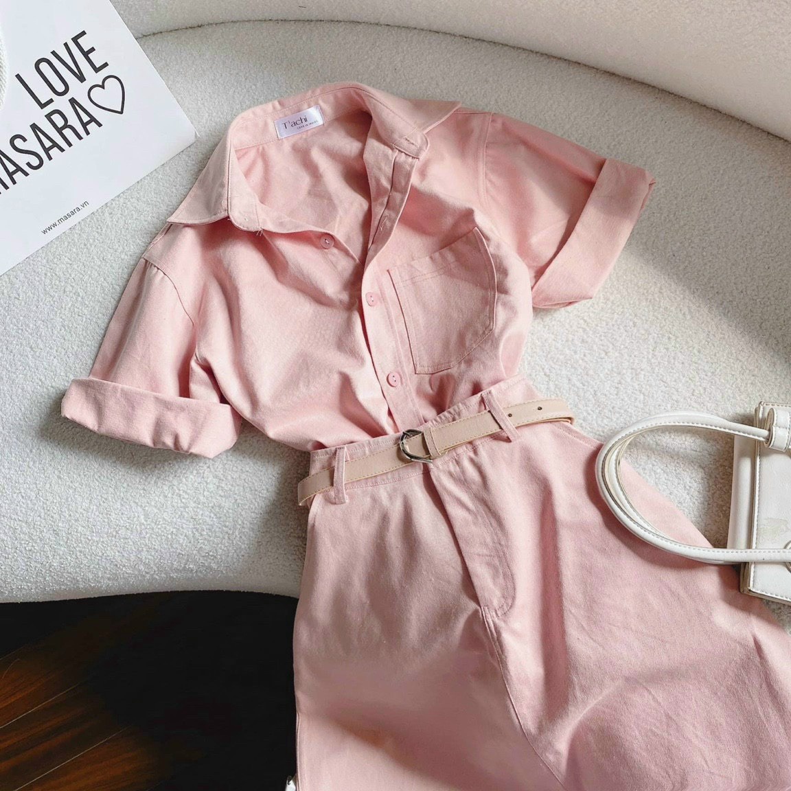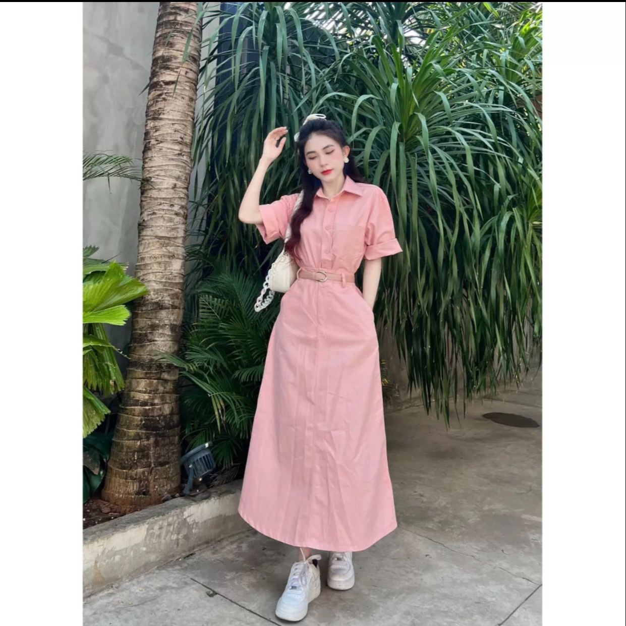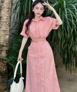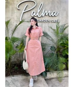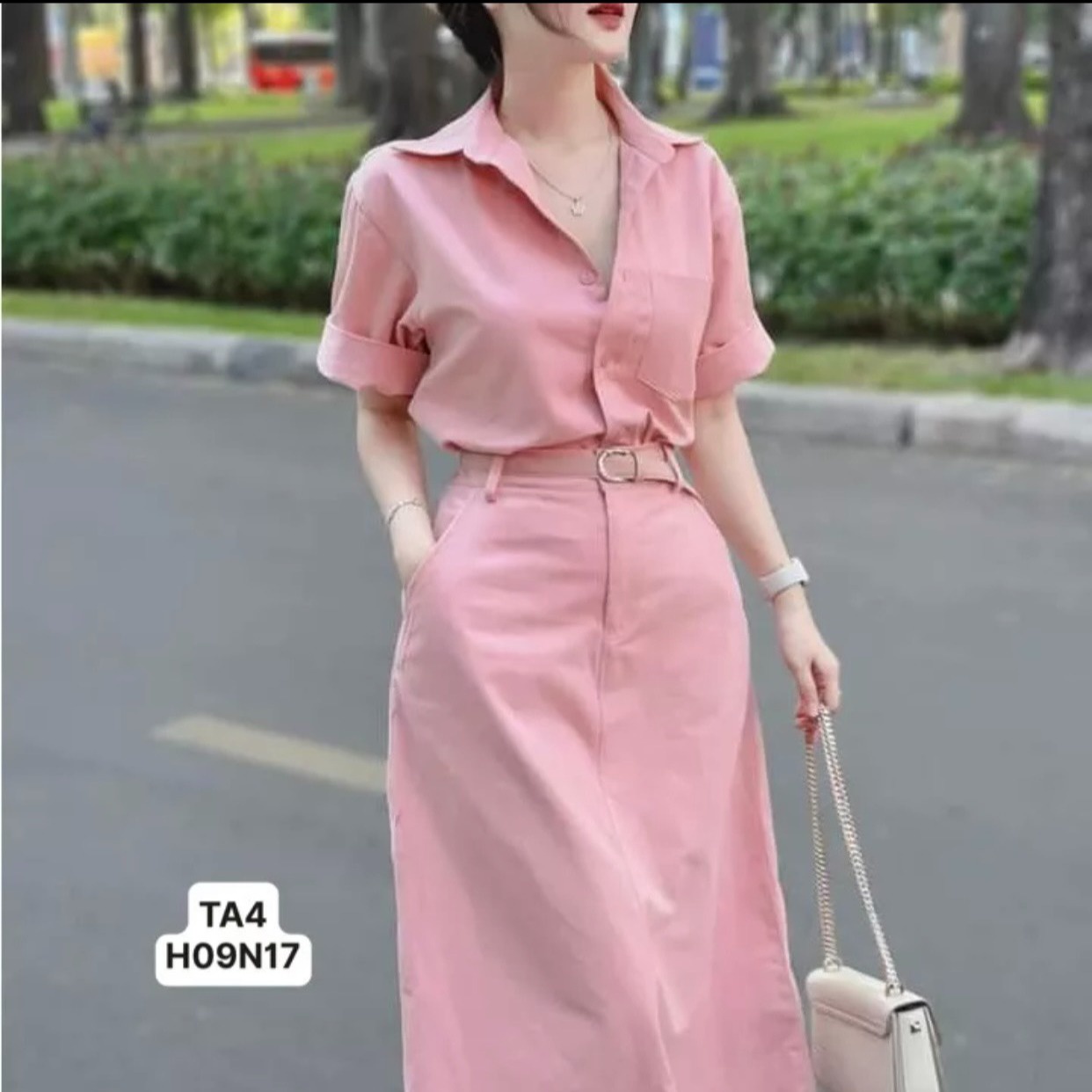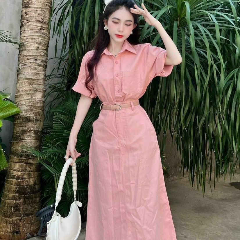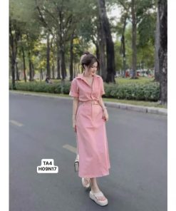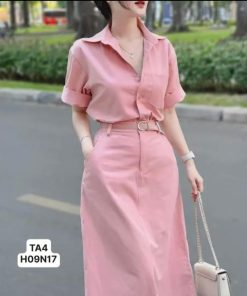 Set bộ đồ nữ áo sơ mi ngắn tay mix chân váy dài với tone màu hồng nhẹ nhàng, xinh xắn ,sáng da dành cho các tình yêu
