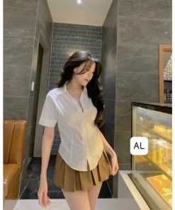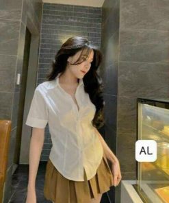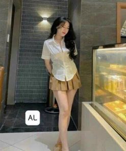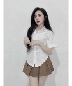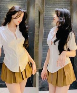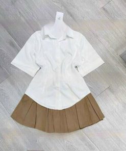 SET BỘ ĐỒ NỮ ÁO SƠ MI TRẮNG NGẮN TAY MIX CHÂN VÁY XẾP LY BT805 – NANA FREESIZE < 53KG