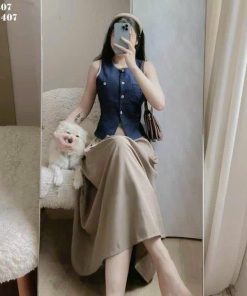 SET BỘ ĐỒ NỮ SÁT NACH TAY PHỐI VIỀN ĐÍNH NÚT MIX CHÂN VÁY DÀI DD105 – NANA FREESIZE < 53KG