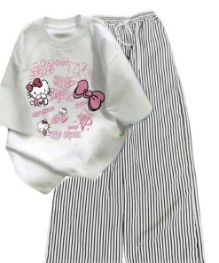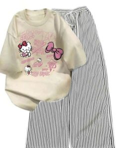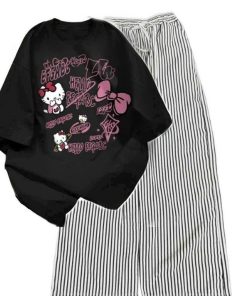 – Tên Sản phẩm: Sét Bộ Đồ Quần Đũi Kẻ Sọc +Mix áo Phông Mèo cute form rộng tay lỡ chất cotton