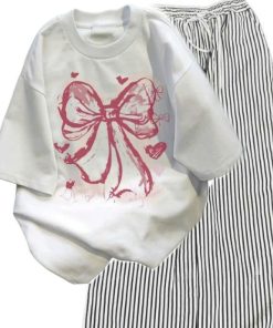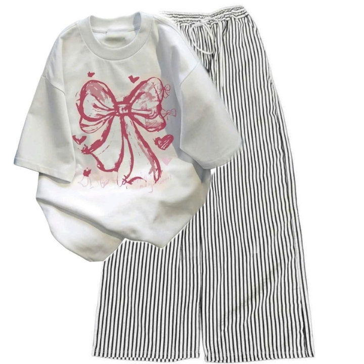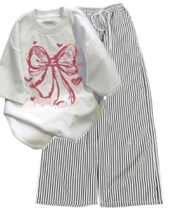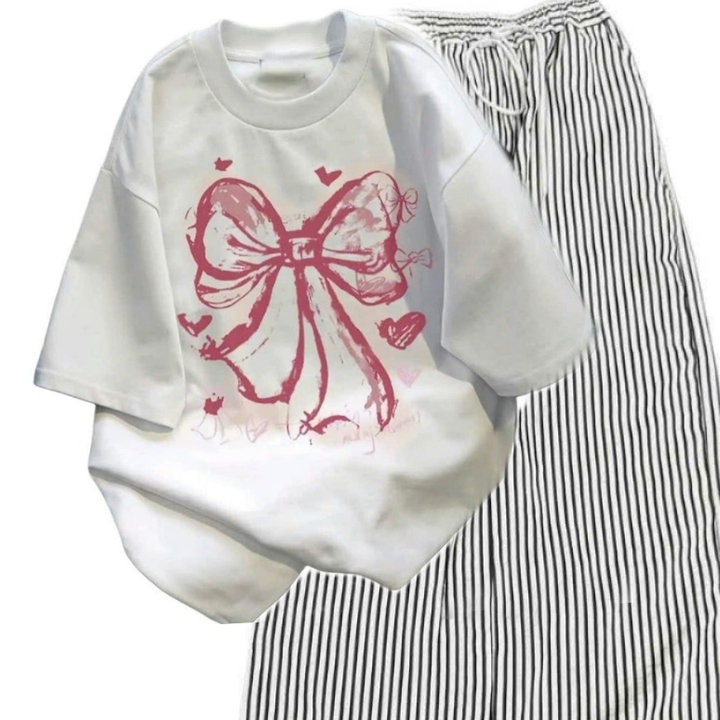 – Tên Sản phẩm: Sét Bộ Đồ Quần Đũi Sọc Vằn + áo phông in Nơ Hồng Loang màu trắng