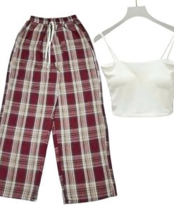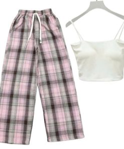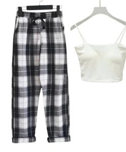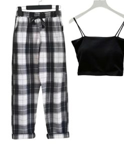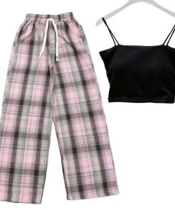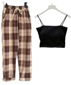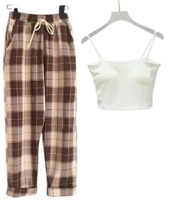– Tên Sản phẩm: Sét bộ đồ quần ống rộng Kẻ Caro + mix áo 2 dây bún chất tăm lạnh