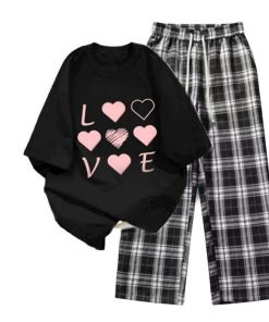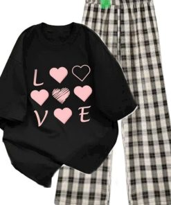 – Tên Sản phẩm: Sét bộ mùa hè quần ống rộng kẻ Caro Đen +mix áo phông form rộng tay lỡ – chữ LOVE