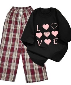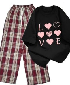 – Tên Sản phẩm: Sét bộ mùa hè quần ống rộng kẻ Caro Đỏ +mix áo phông form rộng tay lỡ – chữ LOVE